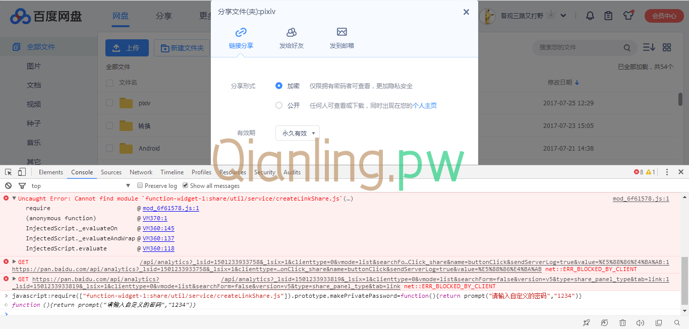 1 | javascript:require(["function-widget-1:share/util/service/createLinkShare.js"]).prototype.makePrivatePassword=function(){return prompt("请输入自定义的密码","1234")} |