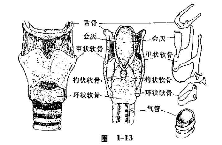 图 1-13 中左图是从正面看喉头,中图是从背面看喉头,右图侧面分解。会厌软骨在喉头上面起喉盖作用。吞咽食物时舌骨向下压,会庆软骨被推弯盖住喉头的通路,防止食物进入喉头和气管。