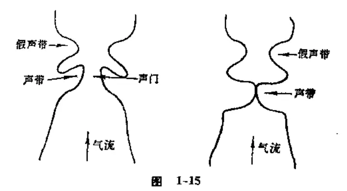 左图是不发声时喉头的状态,这时环杓背侧肌收缩,杓状软骨分开,声带呈倒“V”形,声门敞开,气流可以自由进出。右图是发声时喉头的状态,这时环杓外侧肌收缩,杓状软骨转动靠拢,声带并合,声门关闭。图 1-15 是声带开合的纵剖示意图: