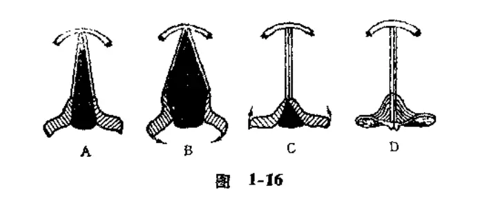 图 1-16 中 A 是正常呼吸,声门敞开,B 是深呼吸,声门大开;C 是耳语,声带基本并合,**杓状软骨之间形成三角形空隙,称为气声门,**气流从这里擦出;D 是发声,杓状软骨转动合拢,声带完全并合。