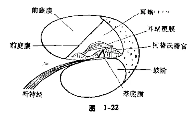 内耳深埋在头骨中,由半规管、前庭窗和耳蜗三部分组成。半规管的作用是维持身体平衡,和听觉无关。前庭窗是内耳的入口,一面和中耳的镫骨相连,一面和内耳的耳蜗相连,把从镫骨接收到的振动传给耳蜗。耳蜗的外形很像蜗牛壳,实际上是一条盘起来的管子,越近中心越细,管中间有一条非常细的导管,叫做耳蜗中阶,把耳蜗分为上下两部分,上一部分叫前庭阶,下一部分叫鼓阶,里面都充满了淋巴液,在耳蜗管的尖端有一个小小的蜗孔,使前庭阶和鼓阶之间的淋巴液可以流通。耳蜗中阶外面包着前庭膜和基底膜,中间充满粘度很高的内淋巴液。前庭膜把中阶和前庭阶隔开,基底膜把中阶和鼓阶隔开。基底膜上附有数以万计的毛细胞,细胞上端和耳蜗覆膜相连,组成非常精细的器官,叫柯替氏器官。柯替氏器官直接和听神经相连,通过毛细胞把接收到的机械运动转化为神经冲动,由听神经传送到大脑。图 1-22 是耳蜗横剖面示意图: