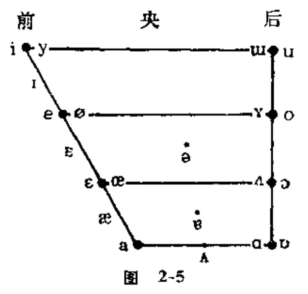 舌位只能确定元音的高低和前后,并不能反映发元音时唇的状态。从原则上说,不管哪一种舌位的元音都可以有相对的圆唇元音和不圆唇元音。但是实际上前元音以不圆唇的较为常见,后元音则以圆唇的居多。八个定位元音正反映了这个特点,四个前元音都是不圆唇的,四个后元音除[ɑ]外都是圆唇的。圆唇的程度和舌位的高低密切相关,舌位越高唇越圆,随着舌位降低,圆唇的程度也降低,图 2-4 中舌位最低的定位元音[ɑ],就是不圆唇元音。图 2-5 列出常见国际音标元音舌位图。