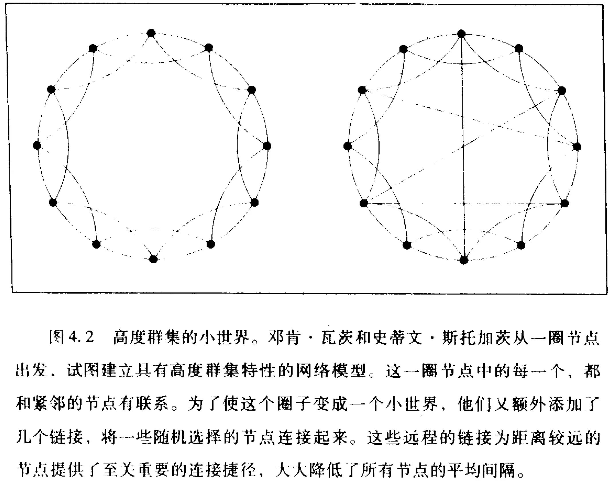 有一段短暂的时期,似乎瓦茨和斯托加茨的更一般性的、群集性更明显的模型似乎要取代艾尔德和莱利的随机宇宙。我们每个人都能想象到这样一幅图景:自己在本地的熟人形成一个圈子,这个圈子里的某些人又有较远的链接,这个情景能非常清楚地解释我们周围的小世界。该模型给出了一个绝佳的折中方案,把艾尔德和莱利的随机世界和规则的格构结合起来。在随机世界里,虽然是个小世界,但是对朋友构成的群集不够友好;而在规则的格构里,节点相互之间的距离太过遥远。