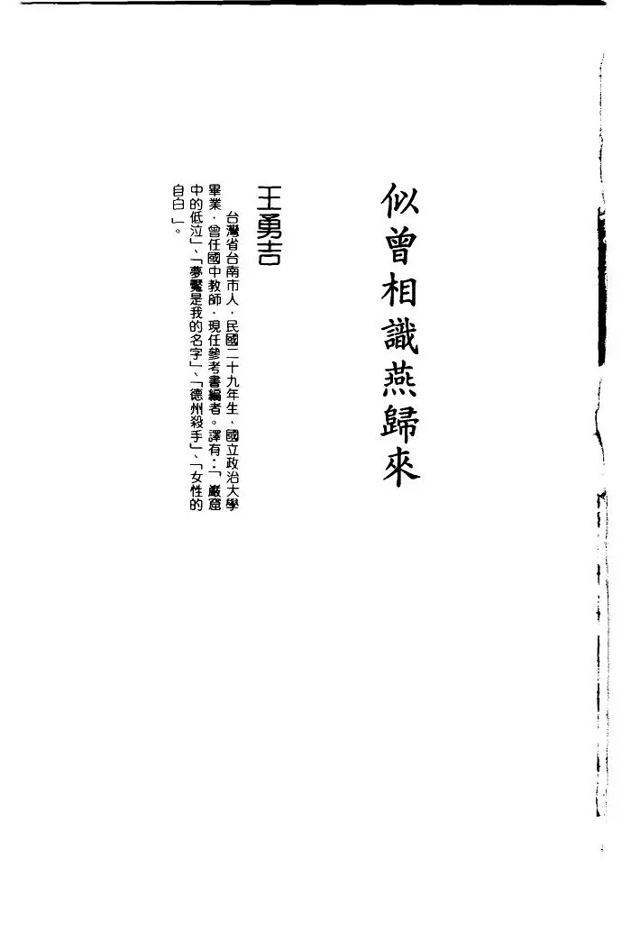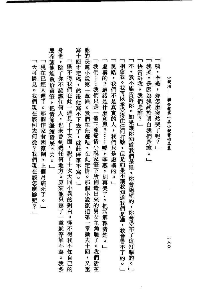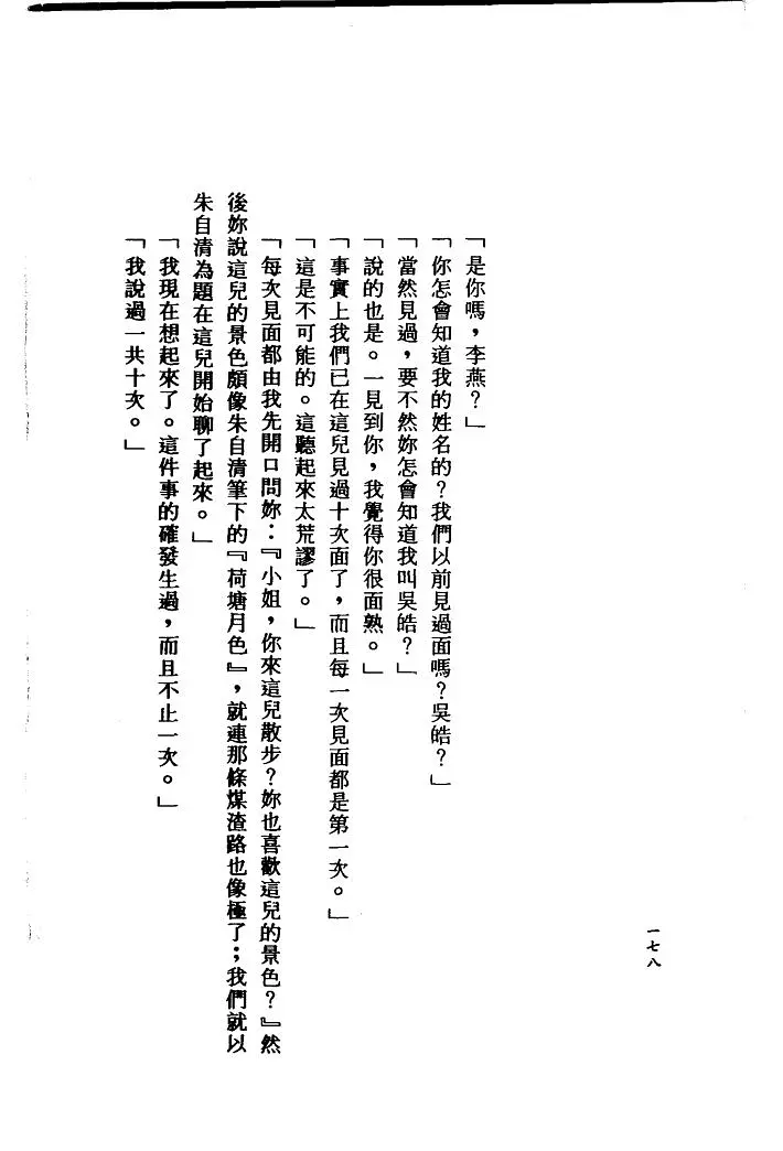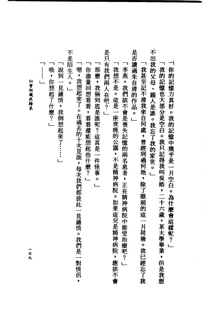 「怪不得我们在此一连见了十次面,说了十次大同小异的对白。怪不得我不知自己的身世,除了你不认识任何人,也未曾到过任何地方。原来他只写了一章就停笔不写。我多么希望他能重拾旧笔,把情节继续发展下去。」
