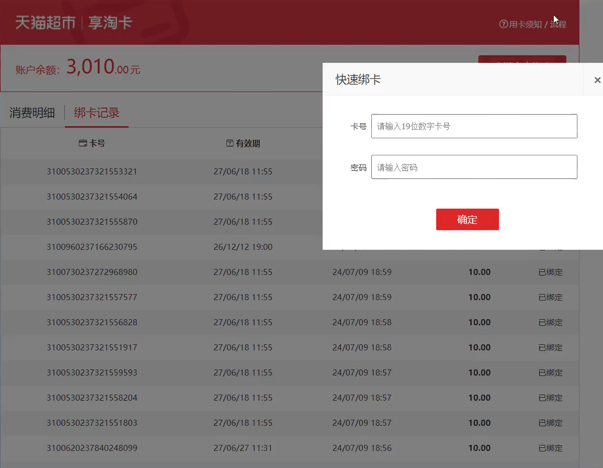 天猫超市享淘卡自动绑定程序